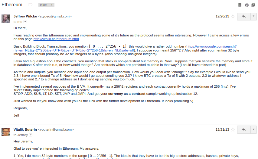 This was the time when the Ethereum protocol was entirely my own creation. From here on, however, new participants started to join the fold. By far the most prominent on the protocol side was Gavin Wood, who reached out to me in an about.me message in December 2013: