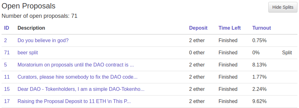 The EIP 186 Carbonvote had ~2.7 million ETH voting. The DAO proposal votes did not fare better, with participation never reaching 10%. And outside of Ethereum things are not sunny either; even in Bitshares, a system where the core social contract is designed around voting, the top delegate in an approval vote only got 17% of the vote, and in Lisk it got up to 30%, though as we will discuss later these systems have other problems of their own.