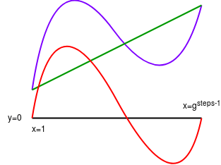 Purple: computational trace polynomial (P). Green: interpolant (I) (notice how the interpolant is constructed to equal the input (which should be the first step of the computational trace) at x=1 and the output (which should be the last step of the computational trace) at \(x=g^{steps-1}\). Red: \(P - I\). Yellow: the minimal polynomial that equals \(0\) at \(x=1\) and \(x=g^{steps-1}\) (that is, \(Z_2\)). Pink: \(\frac{P - I}{Z_2}\).