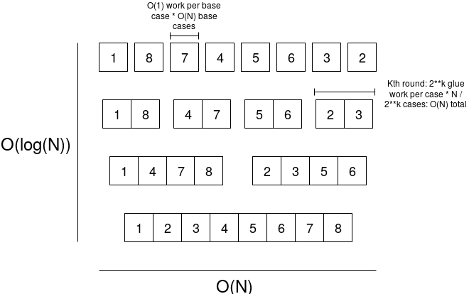 Note that the "glue" in the second procedure has runtime \(O(N)\): if each of the two sub-lists has \(N\) elements, then you need to run through every item in each list once, so it's \(O(N)\) computation total. So the algorithm as a whole works by taking a problem of size \(N\), and breaking it up into two problems of size \(\frac{N}{2}\), plus \(O(N)\) of "glue" execution. There is a theorem called the Master Theorem that lets us compute the total runtime of algorithms like this. It has many sub-cases, but in the case where you break up an execution of size \(N\) into \(k\) sub-cases of size \(\frac{N}{k}\) with \(O(N)\) glue (as is the case here), the result is that the execution takes time \(O(N \cdot log(N))\).