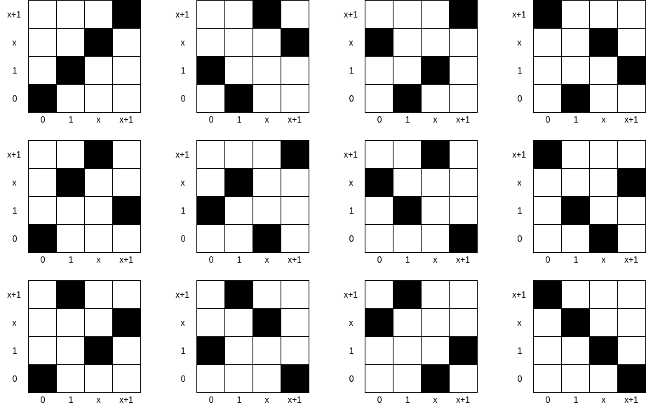Here, we have the same concept as above, except we use an even spookier mathematical structure, the 4-element field of polynomials over \(Z_2\) modulo \(x^2 + x + 1\). This structure has pretty much no reasonable geometric interpretation, so I'll just give you the addition and multiplication tables: