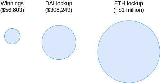 Capital costs - the inconvenience and opportunity cost of locking up large amounts of money - are a challenge that I have come to appreciate much more than I did before. Just looking at the Augur side of things, I needed to lock up 308,249 DAI for an average of about two months to make a $56,803 profit. This works out to about a 175% annualized interest rate; so far, quite a good deal, even compared to the various yield farming crazes of the summer of 2020. But this becomes worse when you take into account what I needed to do on MakerDAO. Because I wanted to keep my exposure to ETH the same, I needed to get my DAI through a CDP, and safely using a CDP required a collateral ratio of over 3x. Hence, the total amount of capital I actually needed to lock up was somewhere around a million dollars.