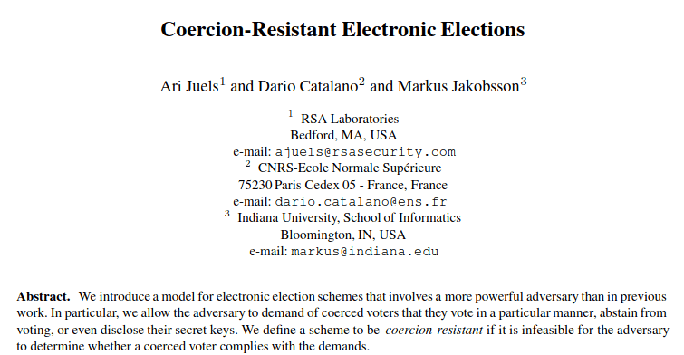 The concept of cryptographically secured execution of social mechanisms was not invented by blockchain geeks, and indeed existed far before us. Outside the blockchain space, there is a 20-year-old tradition of cryptographers working on the secure electronic voting problem, and the good news is that there have been solutions. An important paper that is cited by much of the literature of the last two decades is Juels, Catalano and Jakobsson's 2002 paper titled "Coercion-Resistant Electronic Elections":