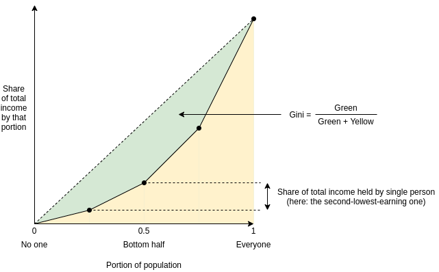 Area-above-curve definition: draw the graph of a function, where \(f(p)\) equals the share of total income earned by the lowest-earning portion of the population (eg. \(f(0.1)\) is the share of total income earned by the lowest-earning 10%). The Gini coefficient is the area between that curve and the \(y=x\) line, as a portion of the whole triangle: