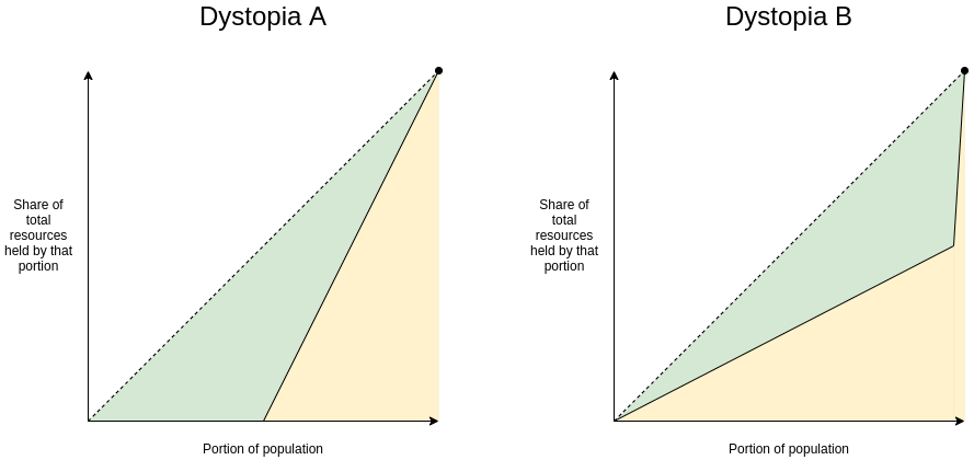 Clearly, neither of those two dystopias are good places to live. But they are not-very-nice places to live in very different ways. Dystopia A gives each resident a coin flip between unthinkably horrific mass starvation if they end up on the left half on the distribution and egalitarian harmony if they end up on the right half. If you're Thanos, you might actually like it! If you're not, it's worth avoiding with the strongest force. Dystopia B, on the other hand, is Brave New World-like: everyone has decently good lives (at least at the time when that snapshot of everyone's resources is taken), but at the high cost of an extremely undemocratic power structure where you'd better hope you have a good overlord. If you're Curtis Yarvin, you might actually like it! If you're not, it's very much worth avoiding too.