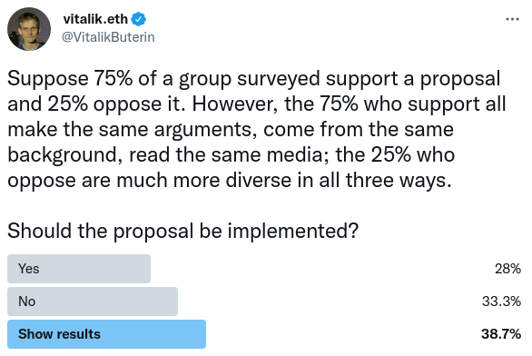 One key goal of the Decentralized Society paper is the idea that it should be possible to make calculations over the graph of attestations. A really important one is measuring decentralization and diversity. For example, many people seem to agree that an ideal voting mechanism would somehow keep diversity in mind, giving greater weight to projects that are supported not just by the largest number of coins or even humans, but by the largest number of truly distinct perspectives.