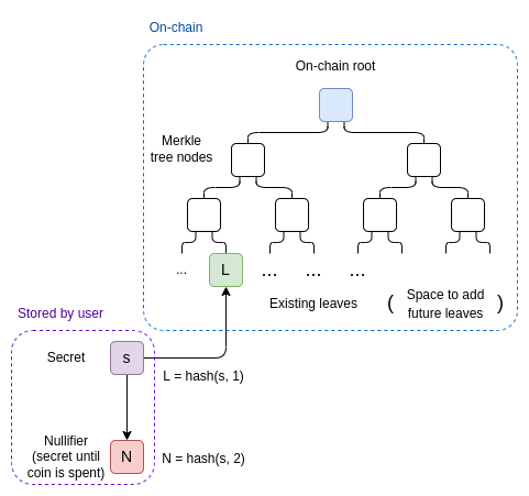 Here's how we solve this. Anyone who has a coin has a private secret \(s\). They locally compute the "leaf" \(L = hash(s, 1)\), which gets published on-chain and becomes part of the state, and \(N = hash(s, 2)\), which we call the nullifier. The state gets stored in a Merkle tree.