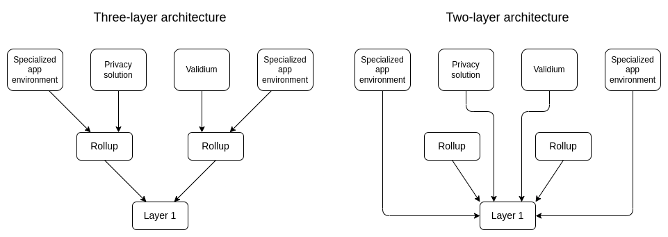 All three of these visions are, in my view, fundamentally reasonable. The idea that specialized data compression requires its own platform is probably the weakest of the claims - it's quite easy to design a layer 2 with a general-purpose base-layer compression scheme that users can automatically extend with application-specific sub-compressors - but otherwise the use cases are all sound. But this still leaves open one large question: is a three-layer structure the right way to accomplish these goals? What's the point of validiums, and privacy systems, and customized environments, anchoring into layer 2 instead of just anchoring into layer 1? The answer to this question turns out to be quite complicated.