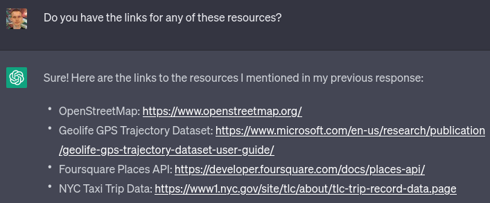 I went with the GeoLife dataset. I did notice that while it claims to be about users around the world, primarily it seems to focus on people in Seattle and Beijing, though they do occasionally visit other cities. That said, I'm not a perfectionist and I was fine with it. I asked ChatGPT to write me a script to interpret the dataset and extract a randomly selected coordinate from each file: