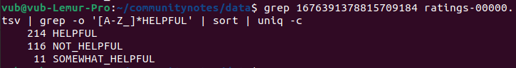 1676391378815709184. We then search for that in thescored_notes.tsvandnote_status_history.tsvfiles generated by running the algorithm. We get:The second column in the first output is the note's current rating. The second output shows the note's history: its current status is in the seventh column (