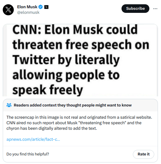 TwitterX have been tumultuous, to say the least. After the platform wasboughtnot boughtbought by Elon Musk for $44 billion last year, Elon enacted sweeping changes to the company's staffing, content moderation and business model, not to mention changes to the culture on the site that may well have been a result of Elon's soft power more than any specific policy decision. But in the middle of these highly contentious actions, one new feature on Twitter grew rapidly in importance, and seems to be beloved by people across the political spectrum: Community Notes.Community Notes is a fact-checking tool that sometimes attaches context notes, like the one on Elon's tweet above, to tweets as a fact-checking and anti-misinformation tool. It was originally called Birdwatch, and was first rolled out as a pilot project in January 2021. Since then, it has expanded in stages, with the most rapid phase of its expansion coinciding with Twitter's takeover by Elon last year. Today, Community Notes appear frequently on tweets that get a very large audience on Twitter, including those on contentious political topics. And both in my view, and in the view of many people across the political spectrum I talk to, the notes, when they appear, are informative and valuable.