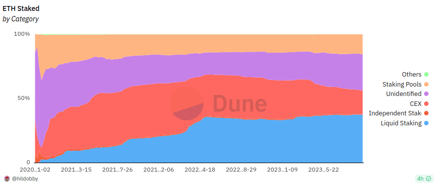 By far the simplest possible "interface" for staking, which satisfies both of these needs, is just an ERC20 token: convert your ETH into "staked ETH", hold it, and then later convert back. And indeed, liquid staking providers such as Lido and Rocketpool have emerged to do just that. However, liquid staking has some natural centralizing mechanics at play: people naturally go into the biggest version of staked ETH because it's most familiar and most liquid (and most well-supported by applications, who in turn support it because it's more familiar and because it's the one the most users will have heard of).