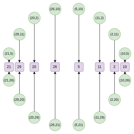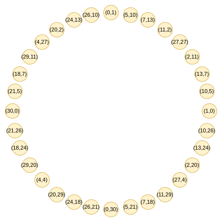 Here is where the clever trick of circle STARKs comes in. Given a prime \(p\), it turns out that we also have easy access to a group of size \(p+1\) that has similar two-to-one properties: the set of points \((x,y)\) where \(x^2 + y^2 = 1\). Let's look at this structure modulo 31: