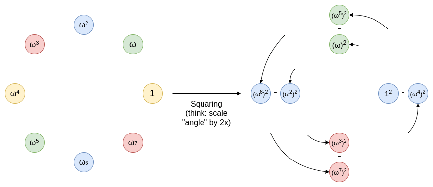 To do this domain reduction, we needed a two-to-one map: \(\{x, -x\} \rightarrow x^2\). What's nice about this two-to-one map is that it's repeatable: if you start with a multiplicative subgroup (a set \(\{1, \omega, \omega^2 ... \omega^{n-1}\}\)), then you start off with a set where for any \(x\) in the set, \(-x\) is also in the set (as if \(x = \omega^k\), \(-x = \omega^{k\pm\frac{N}{2}}\)), and if you then square it to get \(\{1, (\omega^2), (\omega^2)^2 ... (\omega^2)^{\frac{n}{2}-1}\}\), then the exact same property applies, and so you can keep reducing all the way down to one value (though in practice we usually stop a little bit earlier).
