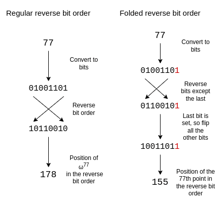 In STARKs, evaluations of a polynomial are typically arranged not in the "natural" order (\(P(1)\), \(P(\omega)\), \(P(\omega^2)\) ... \(P(\omega^{n-1})\)), but rather what I call "reverse bit order":