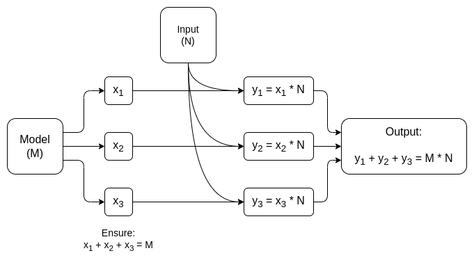 A simplified diagram of a dedicated MPC for matrix multiplication, the largest component in AI model inference. See this paper for more details, including ways to keep both the model and the input private.